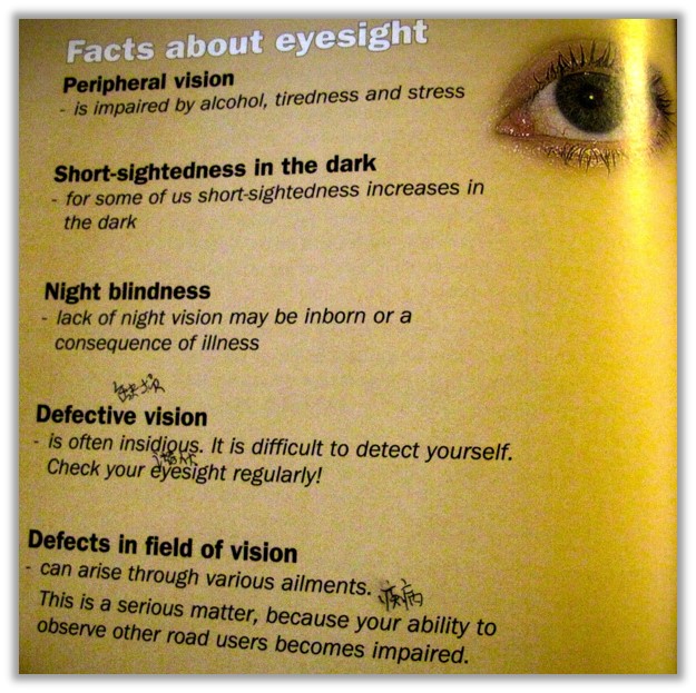 眼睛会为你提供大概90%你所需的信息。获得驾照的重要条件是你的视力必须达到0.5以上,你可以使用眼镜,但你开车时也必须要戴上眼镜。