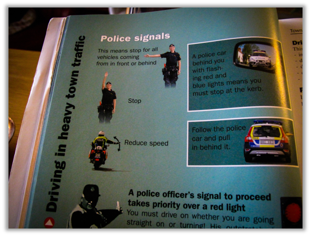 当我们在路上行驶时,有时会遇到警察和警车。你得明白,警察的指挥优先于红绿灯,你必须依照警察的指示驾驶。当警车出现在你的后视镜内并闪烁红蓝灯光时,请立刻靠边停车并接受检查。