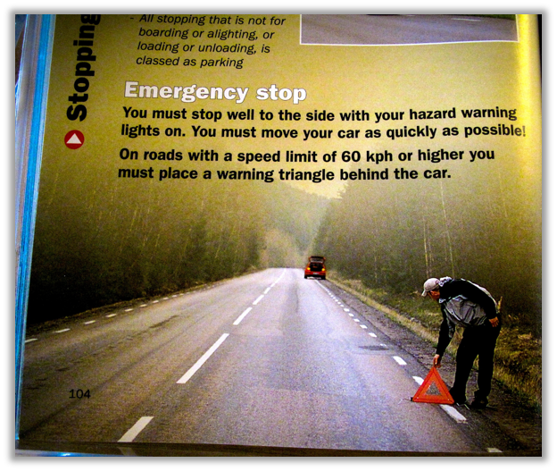 公路停车泊车是一样的道理,也是日常的一部分。停车的首要原则是,不要停在视线受阻的地方,这是一个换位思考的过程,更是一个预防的过程。如果你真的迫不得已,需要停在主路上,那怎么处理呢?书里也告诉你:请在后面放置好三角警示牌,告知来车——此处有车,请预防——这又是另外一个因地制宜的风险预防。