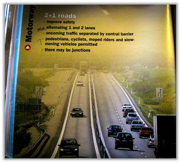 2+1道路:为了降低事故发生率,现在通常会将高速公路和畅行路修建成2+1道路。2+1道路是指每个方向分别有一或两条车道,隔几公里交互出现,同时中间有隔离带,避免正面会车。这种路面可以大大降低正面撞车的风险。同时你要注意,不是所有的2+1道路都是畅行路,所以你要特别留意路口、慢速车辆以及其他道路使用者。