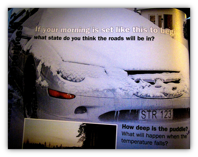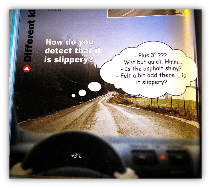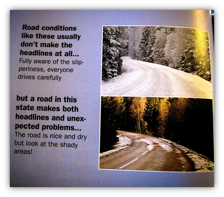 最常见的湿滑状态,注意:路面雪和泥浆; 积雪覆盖的路边沟;冰雪路面;雪烟; 雪丘。