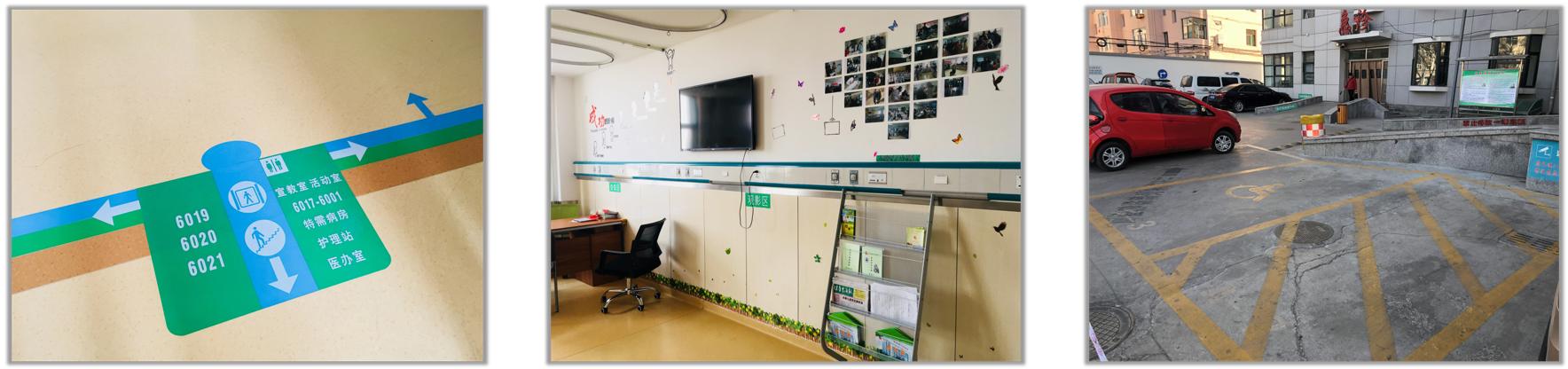 ▲病区地面导引标识 ▲多功能患者活动室 ▲院区无障碍车位