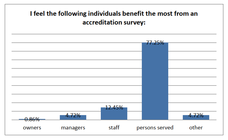 11 or 4.72 % of the respondents chose the answer “others” – 4 of them think that all the listed individuals benefit from the accreditation survey, 4 think that both employees and persons served are the main beneficiaries, one respondent wrote that CARF benefited the most, one wrote it was the community, and one of the respondents is not sure who benefits the most.