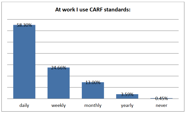 233 respondents answered the question on how often they use CARF standards. 130 or 58.30 % answered they use standards daily, 24.66 % use them weekly and 13 % monthly (see Graph 3.2).