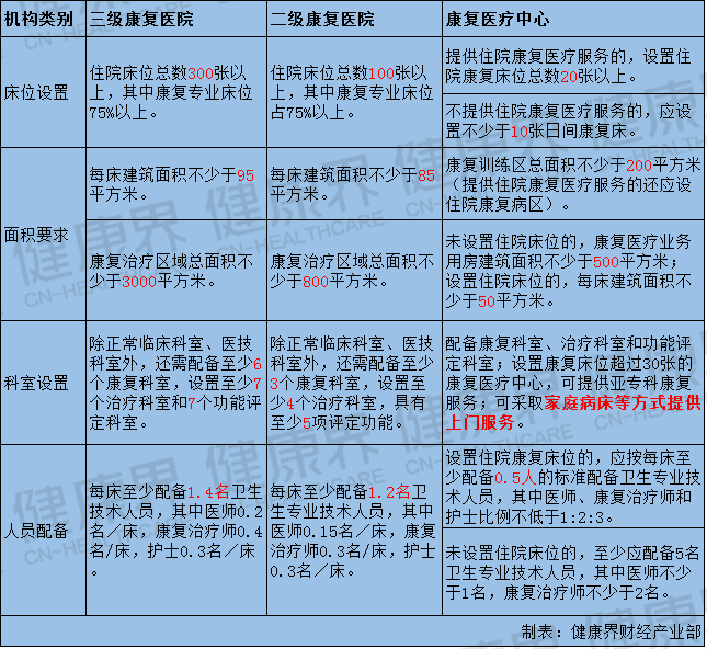 按照政策最低标准来算,设置住院康复医疗服务的,需要2名康复医师、4名康复治疗师、6名康复护士和若干名护理员。