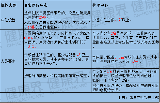 护理中心则需要2名具有5年以上工作经验的执业医师(1名具有内科专业副高及以上任职资格),12名专职护理人员,3名护士(至少1名具有主管护师及以上任职资格)。