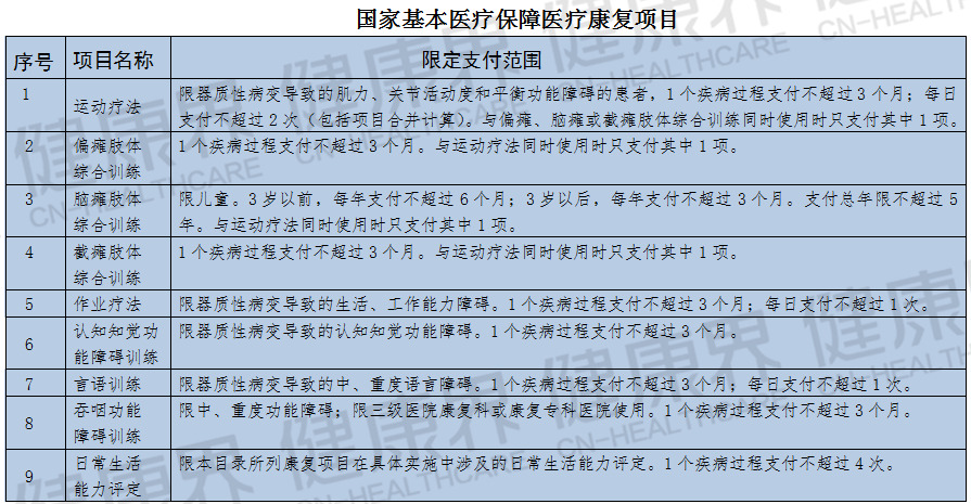 2010年9月,国家卫计委宣布将9项医疗康复项目纳入基本医疗保障范围。2016年4月,人社部、国家卫计委、民政部、财政部、中国残联共同宣布,新增20项医疗康复项目纳入基本医疗保障支付范围。