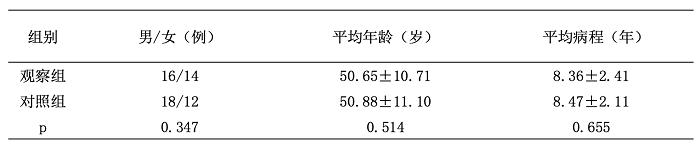 两组患者的年龄、性别、病程差异无统计学意义,具有可比性,详见表1。