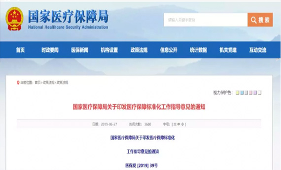 6月27日,国家医保局印发《医疗保障标准化工作指导意见》医保发 [2019] 39号 。