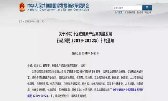国家发改委、教育部、国家卫健委等21部门联合发布“关于印发《促进健康产业高质量发展行动纲要(2019-2022年)》的通知