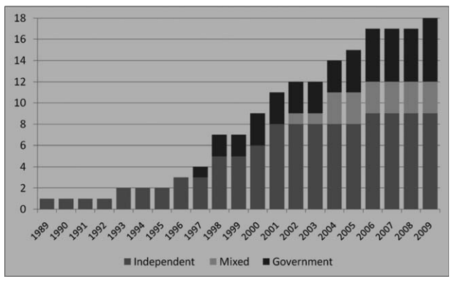 认证组织性质方面,1989年至2009年间,除了独立性医院认证组织,欧洲出现了越来越多的政府性和混合性医院认证组织。十年间新成立的医院认证组织中,只有三个是独立性组织,而其余六个都是混合性或政府性组织(见图1)。