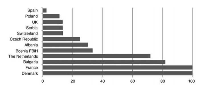 市场饱和度方面,下图展示了实际参与认证项目的医院的比例。存续时间最长的认证组织(西班牙,波兰,英国和瑞士)中参与认证的医院比例依然小于15%。而法国和保加利亚因为强制要求医院参与认证,因此比例最高。