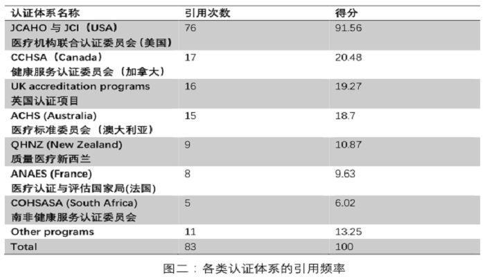 图二统计了在本文索引的数据内,不同认证体系被科研文章引用的次数。其中JCAHO/JCI的认证体系被引用频率高达91%。