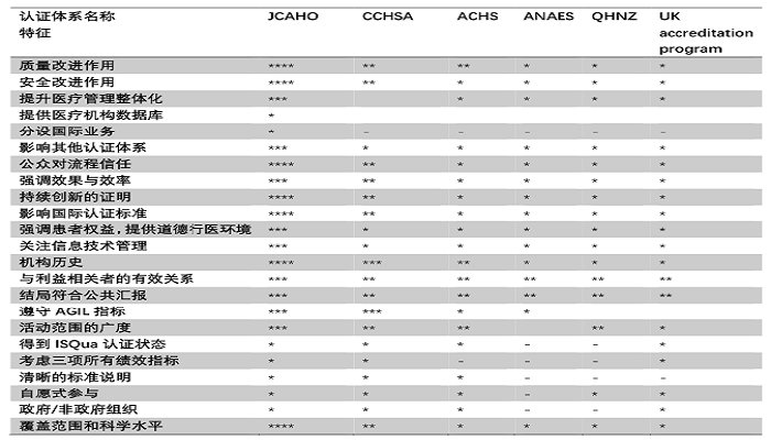 图三罗列出各类认证体系存在的主要共性特征。JCAHO在所有统计的特征中综合表现最佳。