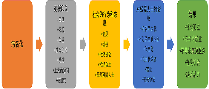 由于污名化的存在,人们看待残障人士时,只能看到他们的残障特征,而忽略了所有其它个人特征。污名化会导致刻板印象,而刻板印象导致歧视和社会性回避。正如图1所示,残障的刻板印象包括“无助“和”负担“,残障人士会被视为单纯的资源消耗者,而不会提供任何回报。此外,残障可能还被视作是上天的惩罚。
