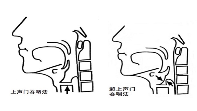 - 超上声门吞咽法:旨在主动向前移动杓状肌,在吞咽之前和吞咽过程中关闭喉前庭的入口。超上声门吞咽法与上声门吞咽相似;然而,在吞咽前屏气期间需要花更多力气以助于声门闭合。