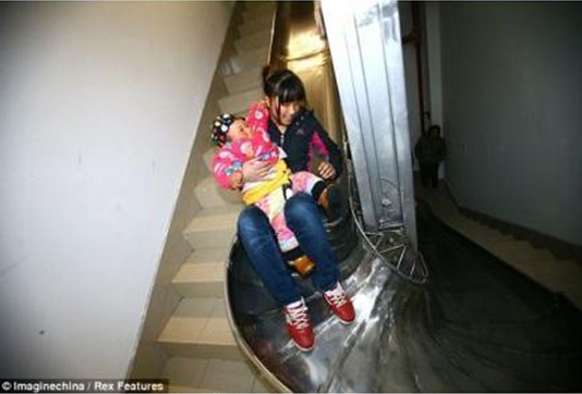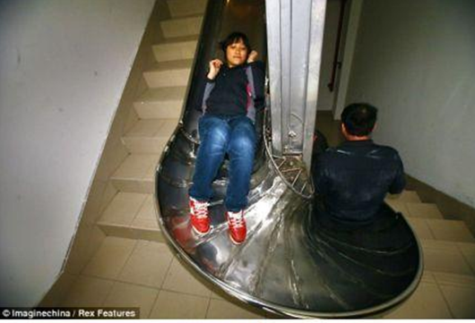 中国发明家周先生近日在上海的一栋大楼里安装了一条不锈钢高速疏散滑梯:楼内居民只需按下一个按钮便可自行滑下,五层楼全程只需14秒即可到达地面。世界知识产权组织称其“安全、快速、便捷、成本低廉”,适合在其他高层建筑中推广。