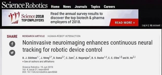 刚刚,顶尖学术刊物《科学》杂志公布:美国卡内基梅隆大学教授贺斌团队开发出了一种可与大脑无创连接的脑机接口,能让人用意念控制机器臂连续、快速运动。