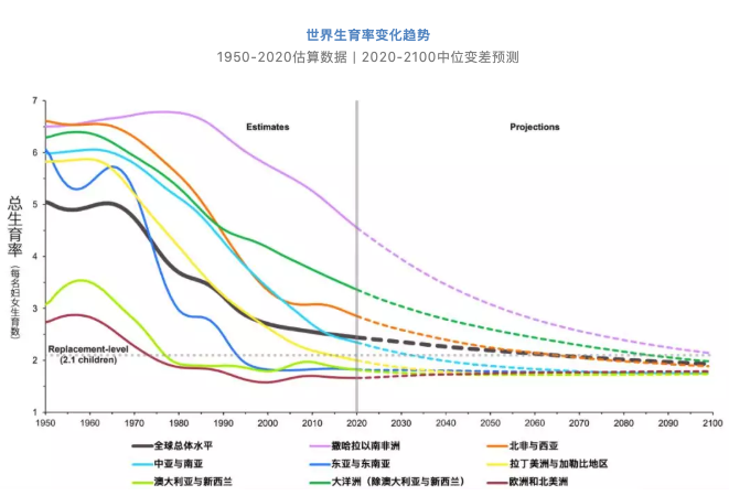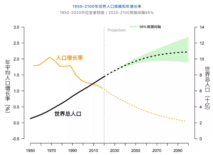 《2019年世界人口展望》报告指出,全球人口预计将从2019年的77亿增加至2050年的97亿;到本世纪末,全球人口将达到110亿左右,但与此同时全球人口增长率持续下降。