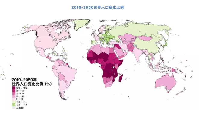 人口快速增长的地区集中在撒哈拉以南的非洲。2019年至2050年,撒哈拉以南非洲的人口预计将增长一倍。其他地区人口增长率则显著不同。北非和西亚为46%,中亚和南亚为25%,拉丁美洲和加勒比海地区为18%,东亚和东南亚2%,欧洲和北美地区仅为2%。