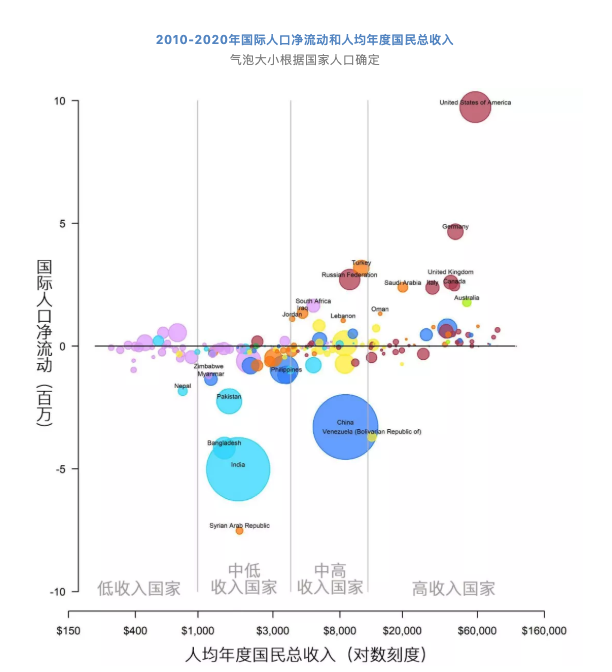 2010年至2020年,欧洲和北美、北非和西亚,及澳大利亚和新西兰是国际迁移的净迁入国,而其他地区则为净迁出国。有14个国家或地区接收超过100万的净迁入移民,而另外则有10个国家贡献了超过100万的净迁出移民。