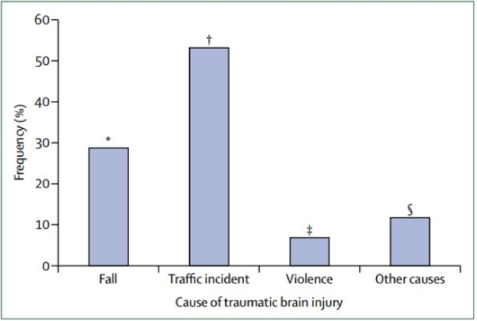 造成TBI的原因:从2001年到2016年,中国的18项回顾性临床研究,报告了125474例急性TBI病例。通过统计,中国TBI的最常见原因是道路交通安全事故(66465[53%]),其次是跌倒(35911[28.6%]),暴力伤害(8532[6.8%]),其他原因(14566[11.6%]),如运动受伤[8]。