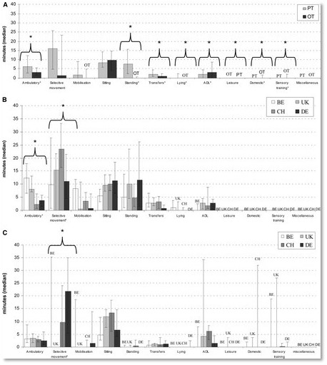 2006年,欧洲4个康复中心(比利时鲁汶大学、英国诺丁汉医院和女王医疗中心、瑞士苏黎世的RehaClinic、德国赫尔佐根奥拉赫医院)为了明确和比较脑卒中患者的PT和OT工作量[2],展开联合研究,针对脑卒中的康复方案进行比较,并作为欧洲中风康复合作评估(CERISE)的一部分。