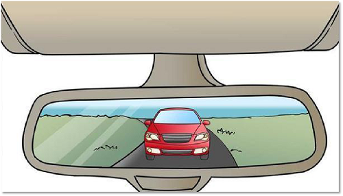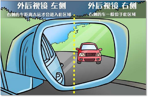 外后视镜:后车占据外后视镜1/3的区域,能看到整台车。此时,后车离你的车距离约有20米,可以进行转向操作。