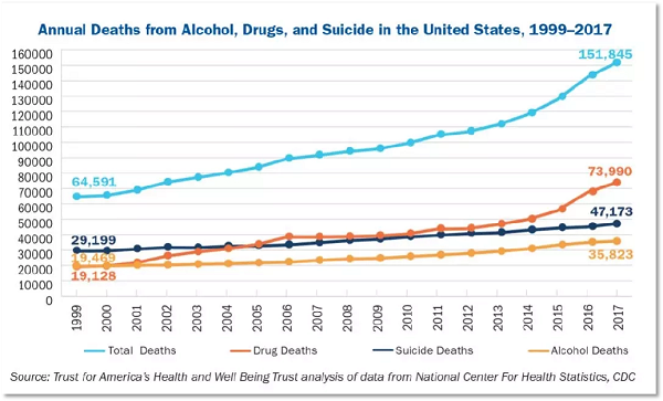 根据以下美国健康信托(TFAH)和乐活信托(WBT)对美国疾病控制和预防中心死亡数据的最新分析显示,2017年有超过15万的美国人死于酒精、毒品以及自杀,比1999年的两倍还多。从2016年到2017年,因酒精、毒品和自杀引起的综合死亡率上升了6%。