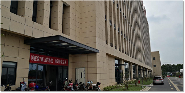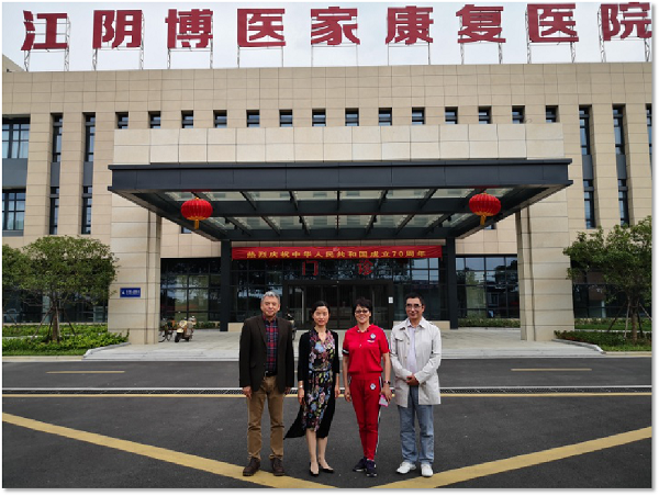 当汽车接近目的地,我们看到的是一个崭新的建筑群屹立在眼前——七层浅咖啡色的建筑外观,虽不高但体量庞大,整体建筑舒展又庄严,大气又不失典雅。车刚停稳,特意从江阴赶来的老友——万国新院长(江阴英智澄江康复医院院长,同为北医团队管理成员。医院刚于2019年6月获得CARF国际康复质量认证最高认证级别证书,成为中国首家通过CARF三年期认证的县级民营康复机构)和博医家领导相艳萍董事长、费春霞院长已等候在医院大门前迎接我们的到来。万院长一如既往身着白衬衫便裤,和医院领导一同陪同我们参观刚落成还没有正式开业的“江阴博医家康复医院”。
