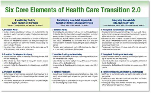 “医疗过渡六大核心要素2.0”定义了支持医疗过渡的基本组成部分。这些组成部分包括建立政策,追踪进展,实施过渡准备评估,为成人医疗、转介、融入成人医院作规划。