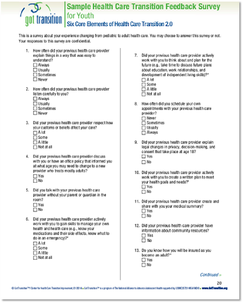 在过渡到成人医疗后,医院对青少年和家长进行匿名调查——医疗过渡反馈调查(Health Care Transition Feedback Surveys),如下所示部分样本: