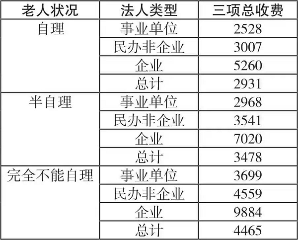 排除一些特殊和极端情况外,表3给出了北京市养老机构平均收费定价(元/月),它涵盖了床位费、餐费和护理费的总和。如果不考虑法人单位类型,只考虑生活自理能力,那么花费最低的应该是生活完全能够自理老年人,三个费用加到一起为2931元/月;花费最高的应该是生活完全不能自理老年人,三者费用之和为4465元/月。如果再考虑法人类型,那么生活能够自理且在事业法人机构的花费应该是最低的,三者合计为2528元/月;而生活完全不能自理且在企业法人机构的老年人花费是最高的,三者之和为9884元/月。如果再考虑到其他杂费,如取暖费、水电费、洗涤费或其他杂费,估计还要再加500元。这样,在北京居住在养老机构,每月至少要花费3000元,最多要花费1万多元。这反映了北京市目前养老机构的整体收费标准和收费水平。
