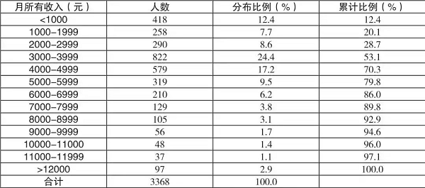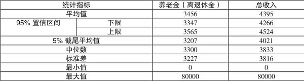 从表4给出的结果看,北京市老年人月平均养老金收入为3456元。因为养老金分布的不均匀,用平均数进行测量会有一定的偏差,而用中位数则更为合适。北京市老年人月收入中位数为3300元。由于养老金最小值为0,最大值为8万元,从而导致平均收入会受到极端值的影响,失去一般意义,所以使用截去两端5%的值后再计算平均数会更有意义。由此得到5%截尾平均养老金为3207元。用同样的办法我们也可以计算老年人月总收入。得到的结果是总收入的月平均值为4395元,中位数值为3833元,5%截尾平均值为4021元。