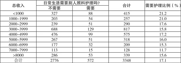 表6:按总收入分的日常生活是否需要照护的老年人数量和比例