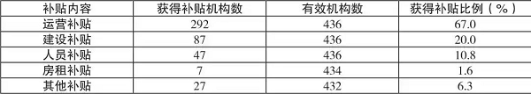表9:不同法人类型机构获得的各类运营补贴额度的描述统计(万元)