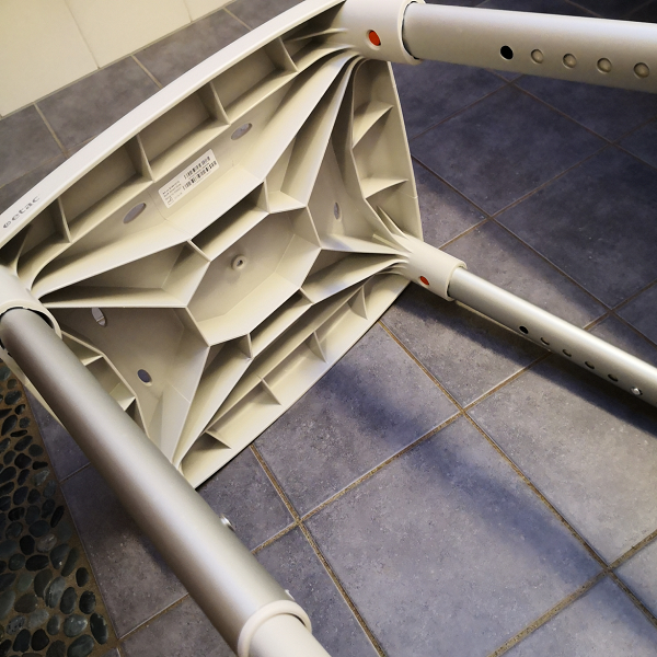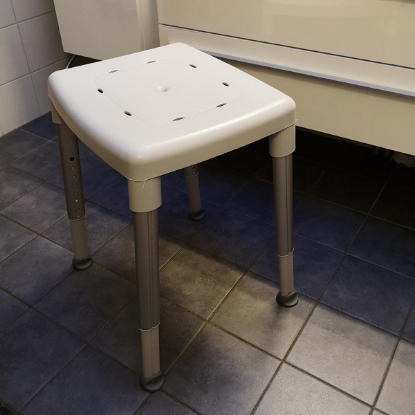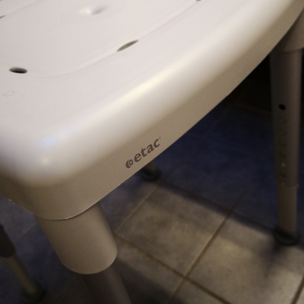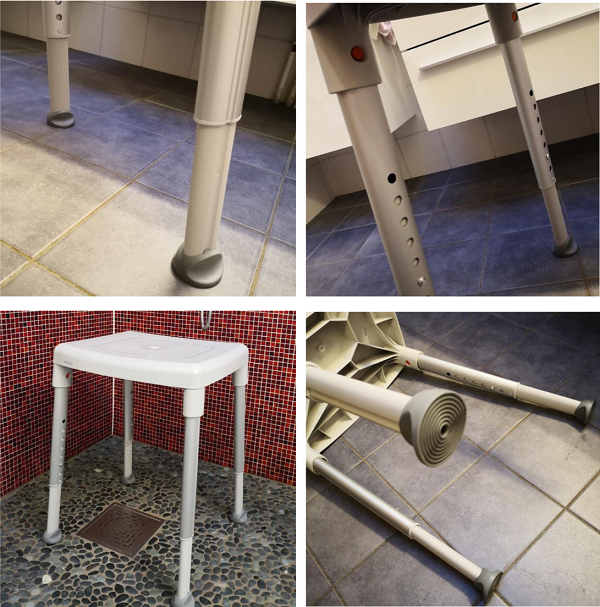 以上这张图,便是我们本次文章的“主人翁”,正侧位45度角看它,第一感觉就是宽大的凳面,粗壮的四肢,淡雅的色调。凳面的宽大超乎你的想象,略微下陷的设计让你的臀部有着十足的“安全感”,八个不大的镂空眼在不影响凳面牢固度的同时起到了排水的作用,更确保了凳面干爽。不禁有观者会说,设计这么大的凳面,是因为西方“身宽体胖”者多,但小编认为宽大的凳面无疑让患者可以做得更稳定。对于站立困难的服务对象来说,一把让屁股坐着感觉很结实的凳子总是令人舒心的。有趣的是,在小编用华为手机拍摄时,粗壮的凳脚被手机自带的“场景识别”功能提示为“狗”,不过小编觉得它更像四条大腿,粗壮而结实。