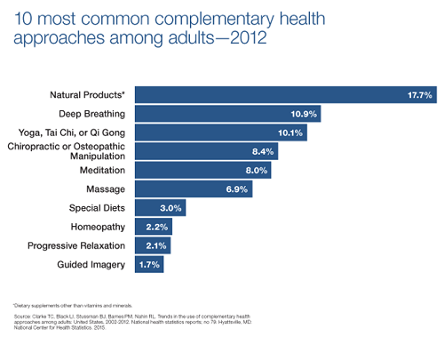 根据美国2012年全国健康采访普查显示(NHIS),17.7%的美国成人在过去一年中使用过除维生素和矿物质之外的其他膳食补充物。以下这些产品是普查过程中出现最多的补充性疗法内容,最为常用的自然产品就是鱼油。