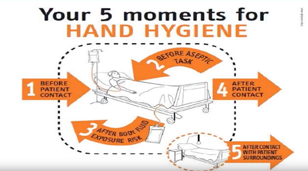 手卫生的5个时刻:接触病人前、无菌操作前、暴露于患者体液后、接触患者后、接触患者周围环境后。