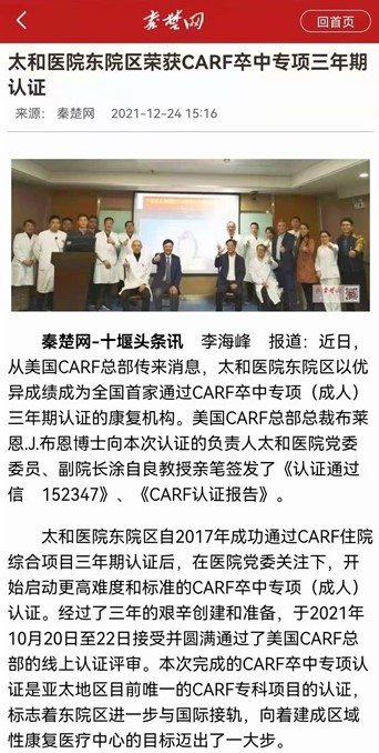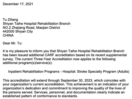 贺并记十堰市太和医院康复院区获得CARF国际卒中专项最高级认证