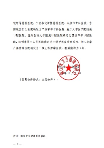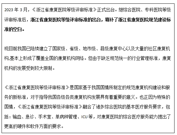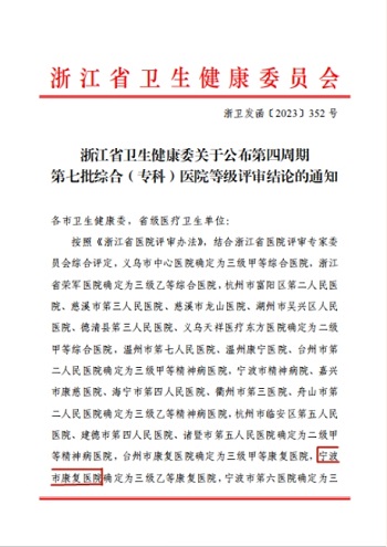 2024年1月2日,宁波市康复医院收到浙江省卫生健康委员会的通知,在浙江省第四周期第七批综合(专科)医院等级评审中,顺利通过评审考核成功晋级三级乙等康复医院。