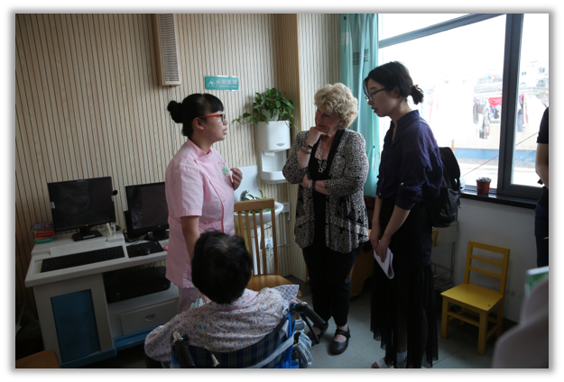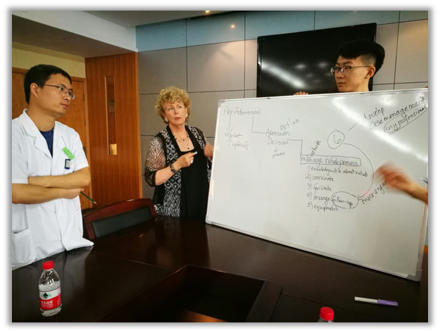 两天的现场工作日程满满,Christine女士对医院行政管理及临床服务工作进行访谈,并对团队会议、晨会和病区夜班工作进行了细致的参观指导。在交流过程中,临床人员提出了很多有价值的问题,尤其对提高护士和治疗师的协作方面和Christine进行了探讨。Christine认可了对促进护治沟通所做的努力,如护治沟通本、微信群、治疗记录共享等;也提出了改进建议:如简化不必要的信息重复,建议护治共同评估ADL共同探讨评分,建议治疗师来病区环境中指导患者等等。