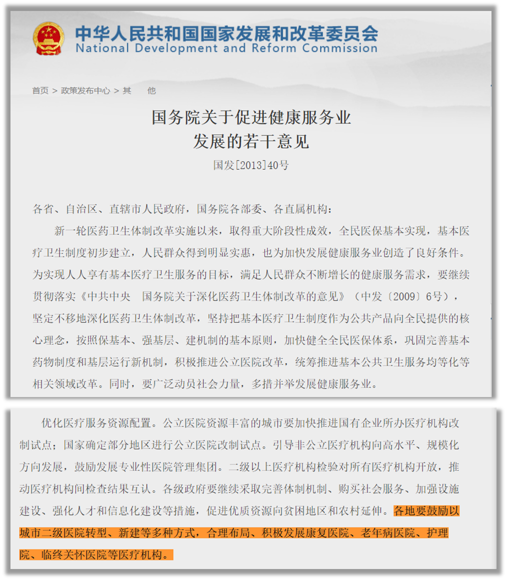 2013年,国务院发布《关于促进健康服务业发展的若干意见》对康复医院影响深远,政策鼓励以城市二级医院转型、新建等多种方式,积极发展康复医院、老年病院、护理院,积极引导社会资本举办非营利性医疗机构,重点引导非公立医院向高水平、规模化、集团化发展。康复医院等紧缺型医疗机构设立、开办、执业资格、医保定点的审批手续得到了简化。一时间,康复医院成为社会办医的热点,在政策的带动下,非公康复机构医疗沐浴着政策的春风正在如火如荼的发展,忽如一夜春风来,千树万树梨花开,社会办医赶上了最好的时代!