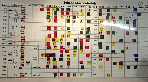 如上图所见,SHARP医院制作了详尽的患者治疗日程表。SHARP用各种办法,尽可能的把患者每天的治疗计划展示出来,既方便了医治护工作人员对于工作量的确认,又方便了患者随时掌握自己的治疗时间和内容,这正是CARF标准所强调的工作细节要求。SHARP医院对待CARF如此认真的精神也是十分值得我们赞扬和学习的。