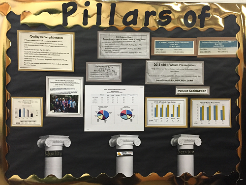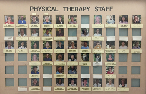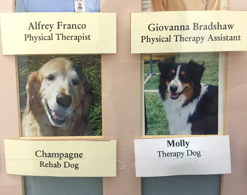 这是什么?两只可爱狗狗!在SHARP医院的员工介绍宣传栏中,两只可爱的狗狗映入我的眼帘,而且分别有自己的名字,并被赋予了“治疗狗”的专业职称,真的是太有意思了。作为人类的好伙伴,狗狗除了在盲人的导盲中起到了很大的作用以外,SHARP医院还把狗狗加入到物理治疗的工作中。很遗憾,由于时间关系,我们没能深入观摩狗狗们在治疗中的具体作用体现,只能留待下次的访问学习去解答了。