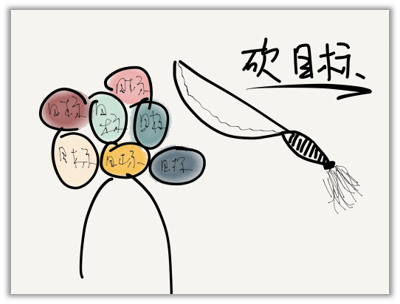 尽管通过前面的讨论,年度计划已经越来越靠谱了,但是时间资源不够的问题仍然没有解决啊?我们只能做减法,减少自己的欲望和目标,才能释放出大块的时间资源,只是通过闪转腾挪、挤时间的方式,没办法有质的改变。那把哪个目标砍掉呢?都是自己特别想要的啊,真的不忍心,我们又一起过了一遍年度目标,我们把大刀架在了「口译初级证」这个目标的头上,为什么选它呢?
