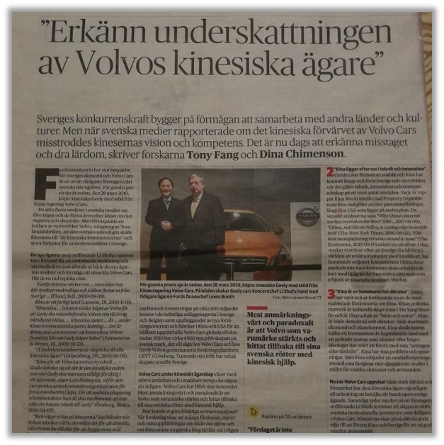 瑞典的竞争力在于可以和其他国家合作、互补。瑞典媒体对沃尔沃和吉利的报道是一个活生生的例子,它证实了我们误判了中国人的想法和能力,它也证实了我们对待中国和中国企业的方式是不礼貌的。每个人都会犯错,但我们必须要学会承认错误,并从中吸取教训。