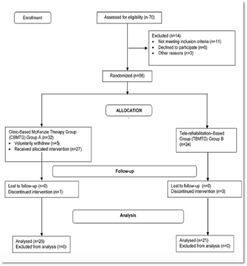 研究首先获奥勃洛沃大学研究与道德委员会下属的公共卫生研究所卫生研究道德委员会的研究道德许可。参与对象为同一时期的就诊患者,在被招募后随机分配到两个临床研究组内(诊所治疗与远程康复治疗)进行为期8周的治疗项目。自愿参与、且满足条件的对象由同一助手随机分配进入A组或B组。该助手并未参与到患者的评估和治疗过程中。